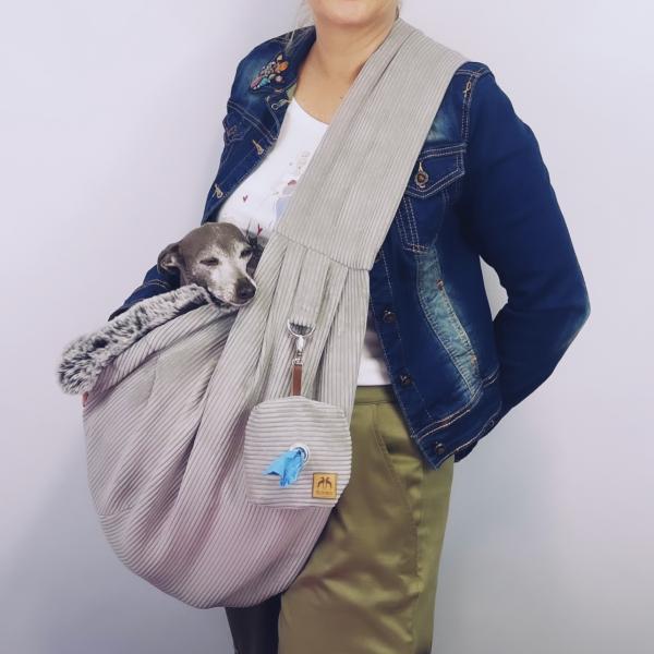 Eine Crossbag Tasche für Hunde mit weichen kuscheligen Innenfell (Kunstfell) und hellgrauen Cord Decorstoff. Ein toller Stoff, immer stylish und passend.