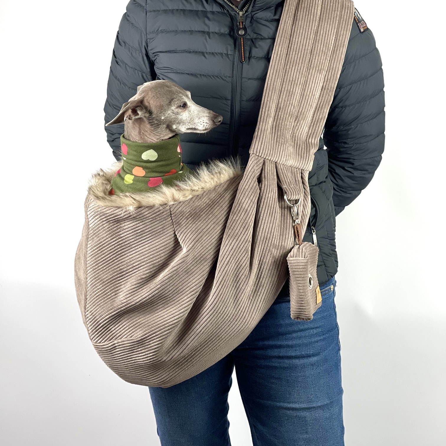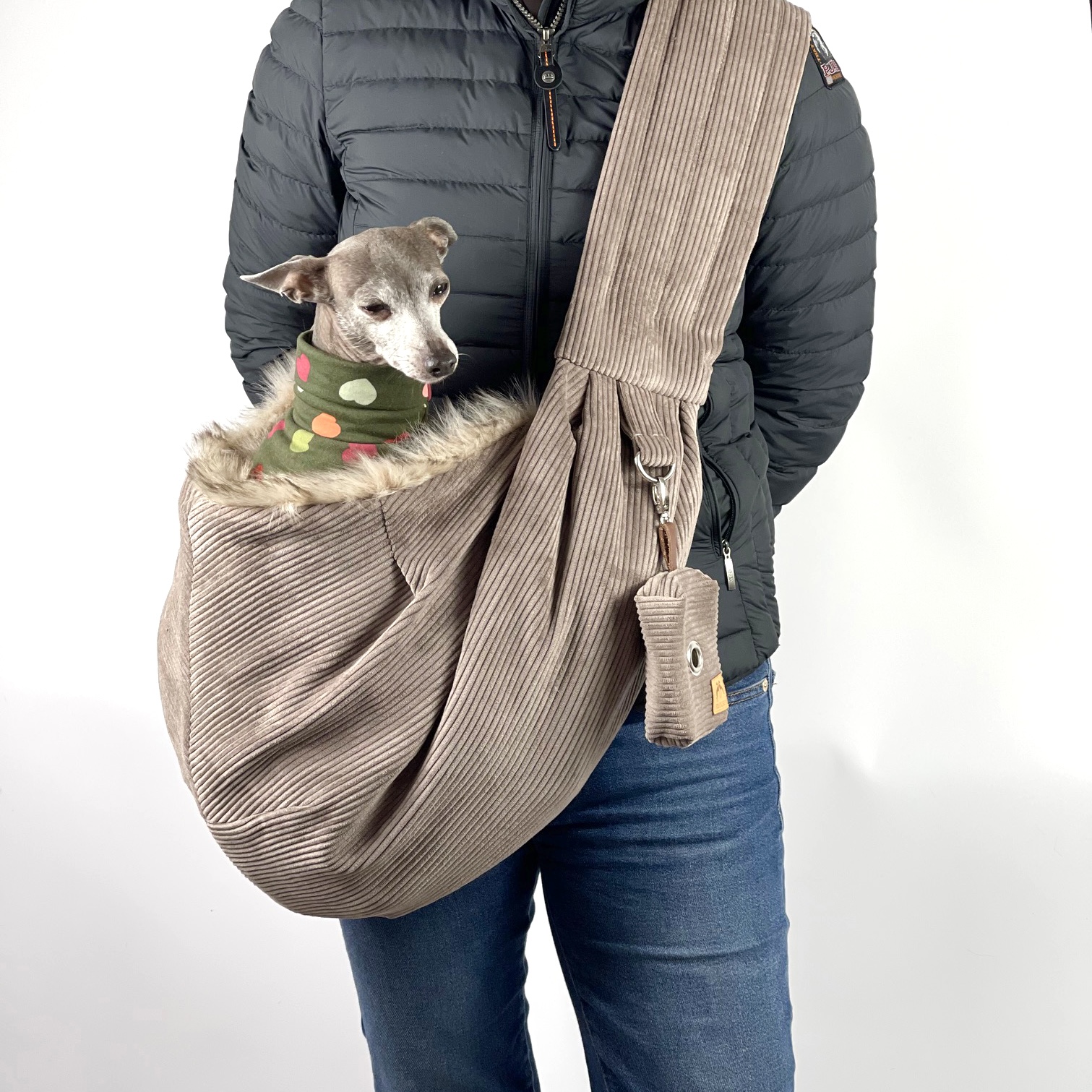 Eine Crossbag Tasche für Hunde mit weichen kuscheligen Innenfell (Kunstfell) und Cord Decorstoff. Ein toller Stoff, immer stylish und passend.