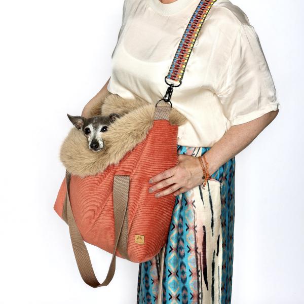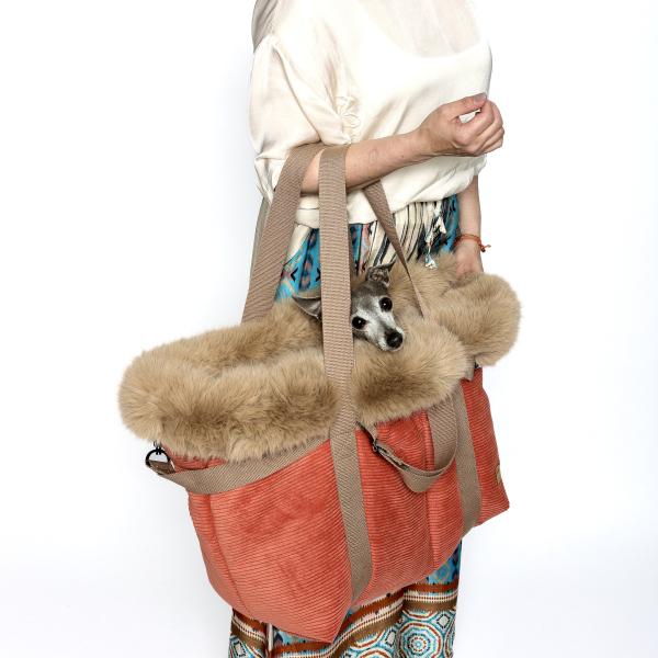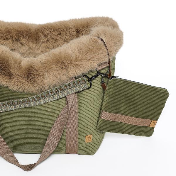 Zusätzlich könnt ihr das Deluxe Set dazubuchen. Das beinhaltet einen Wechselhenkel mit Muster, ein Bodenkissen mit einer Seite Kunstfell und einer Seite Cord, eine Minileine zum befestigen an der Tasche und die kleine Dokumententasche. Alles kommt in passender Farbe zur gewählten Kuschelhöhle to go.