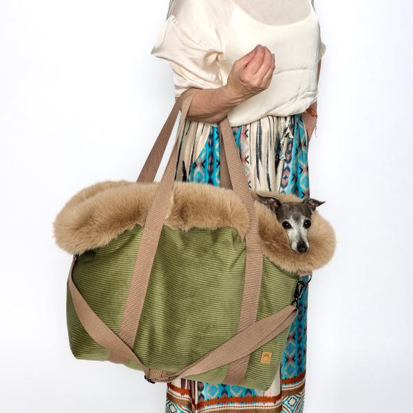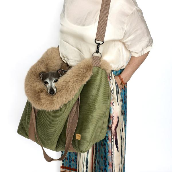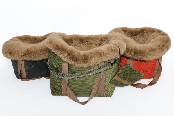 Zusätzlich könnt ihr das Deluxe Set dazubuchen. Das beinhaltet einen Wechselhenkel mit Muster, ein Bodenkissen mit einer Seite Kunstfell und einer Seite Cord, eine Minileine zum befestigen an der Tasche und die kleine Dokumententasche. Alles kommt in passender Farbe zur gewählten Kuschelhöhle to go.