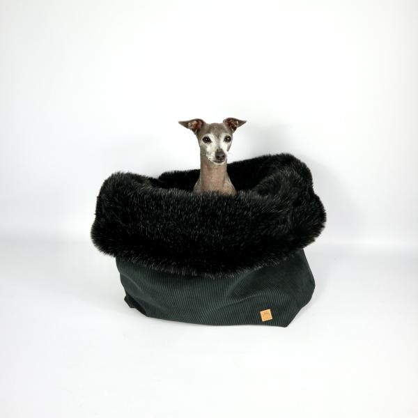 Ein Bett wie auf Wolke 7 mit kuscheligenFell und stabilen Cord Decorstoff.