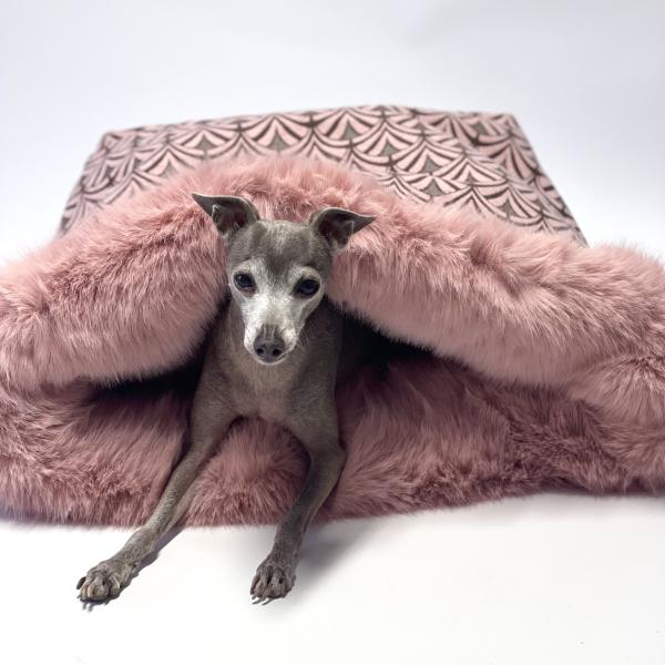 Ein Traumhafter Stoff für Alle die nach etwas Besonderen suchen. Das Muster aus der Art Deco Zeit, ist elegant und zeitlos. Das besonders hochwertige und sehr weiche Kunstfell ist dick und kuschelig. Da kann sich jeder Hund nur glücklich darin betten.