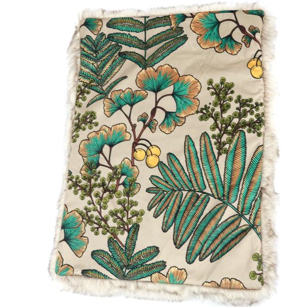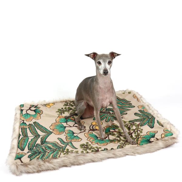 In liebevoller Handarbeit von uns in unserem Atelier hergestellt. Die Hundedecke zum Selbstgestalten. Der traumhafte Ginkgo Velourdecor Stoff in verschiedenen Farben und unsere kuschelweichen Felle zu kombinieren.
